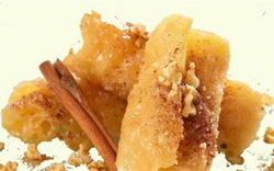 Βουτάμε τις δίπλες στο καυτό σιρόπι και τις ραντίζουμε με τριμμένα καρύδια και κανέλλα.